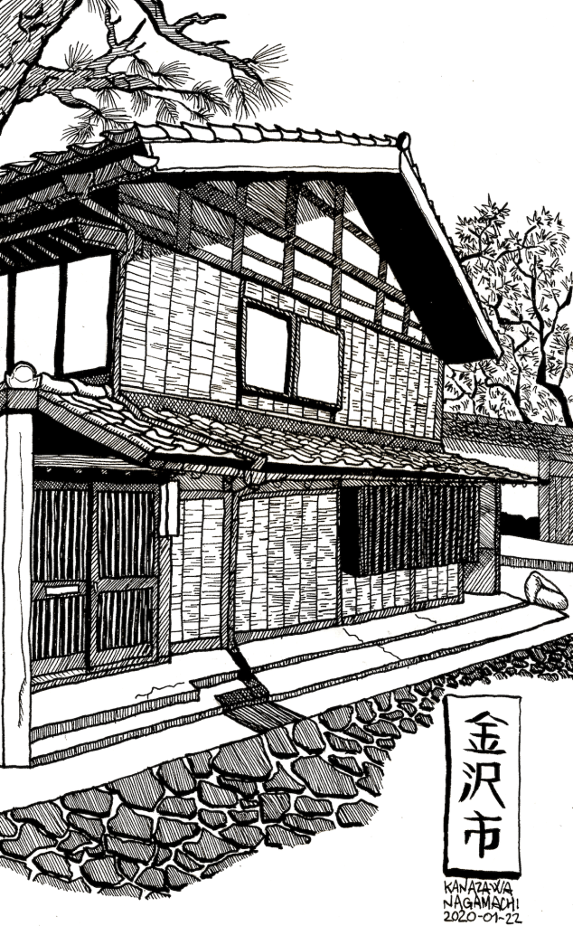 After a couple of quick sketches just to get comfortable with the various pens and brushes, I chose a photo I took in the Nagamachi district in Kanazawa in 2016 as the model to break in my new sketchbook.