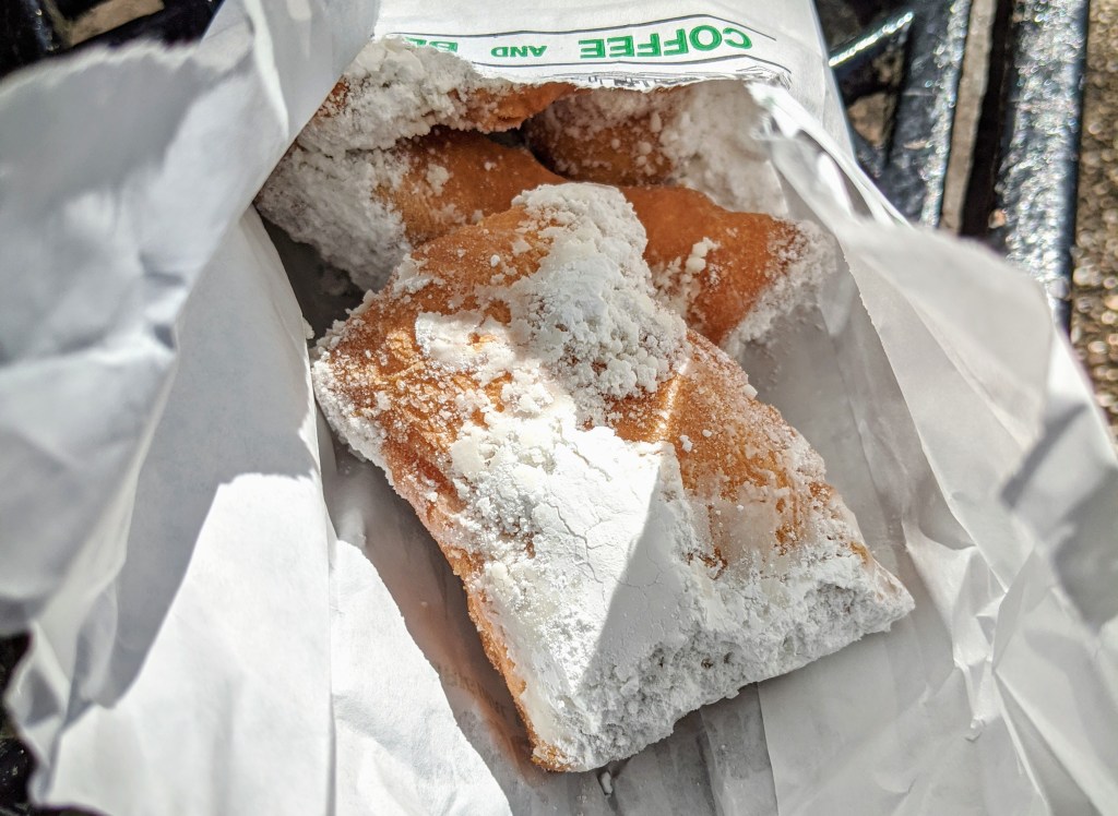 On one side, people lining up along Jackson Square to grab a table; on the other, people lining up in a kind of a back alley, stinky from last night’s hard-partying, to grab their breakfast to go. I did a bit of both, then settled for the stinky alley line that looked shorter, but turned out to be so much slower.