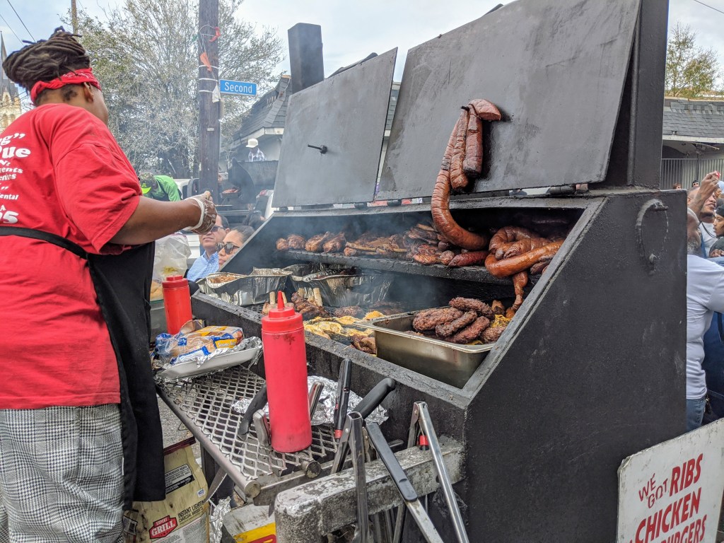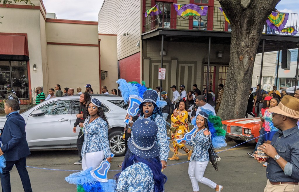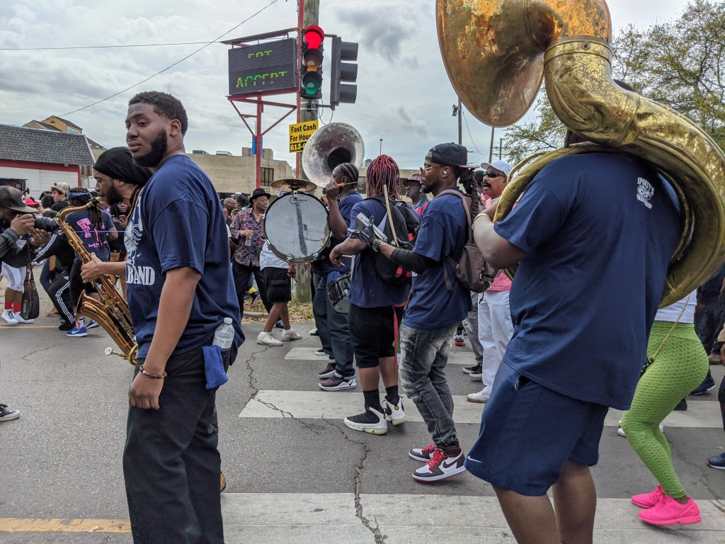The floats leading far away, then the social club with fancy outfits dancing, and the brass band in second line closing the parade, surrounded by the crowd, everybody dancing, on those bumpy rhythms, everybody singing along.
