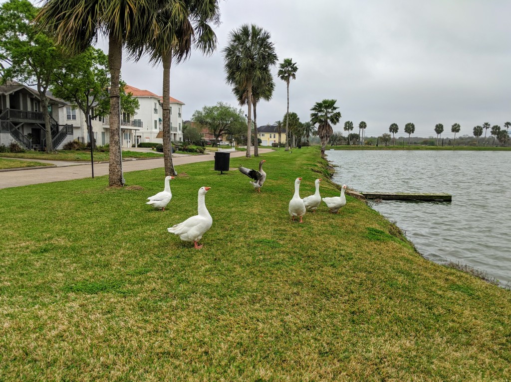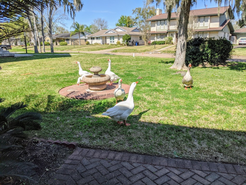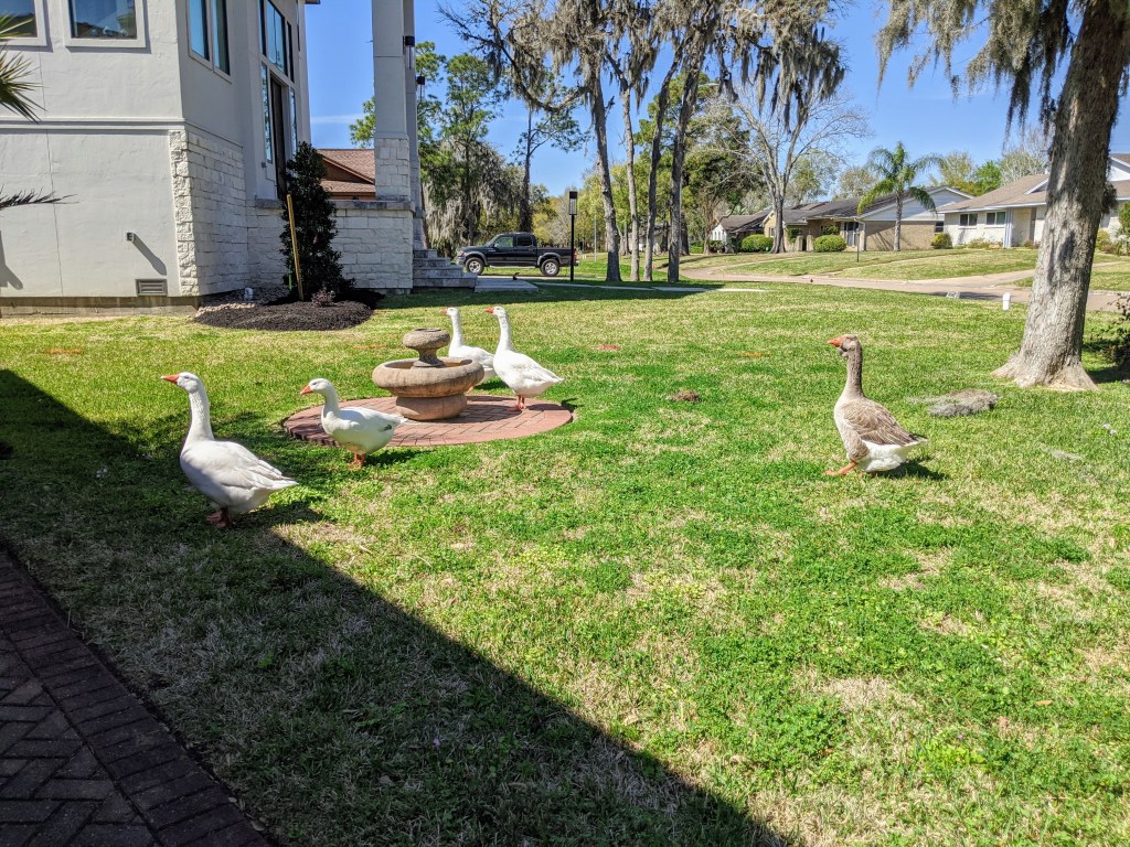 Oddly enough, a group of nasty geese wandered around the neighborhood with a fixed daily schedule. They were almost as huge as the Saturn V rocket at the Space Center, and equally freaky.