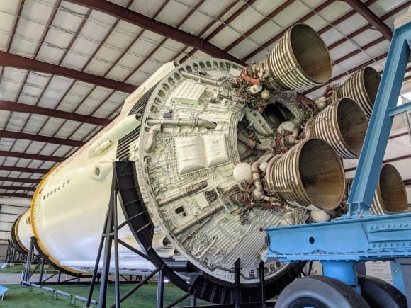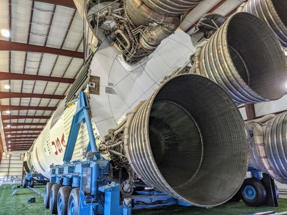The huge engines of the first stage (S-IC) of the Saturn V