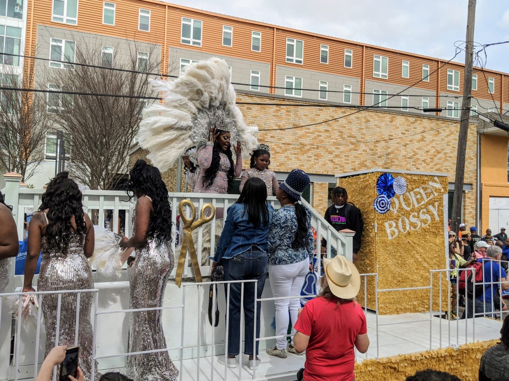 I arrived on time (which means: roughly one hour early) at the starting point, a bar just outside the Warehouse District, where parade floats, the first brass band, and the aforementioned VIP Ladies and Kids were getting ready.